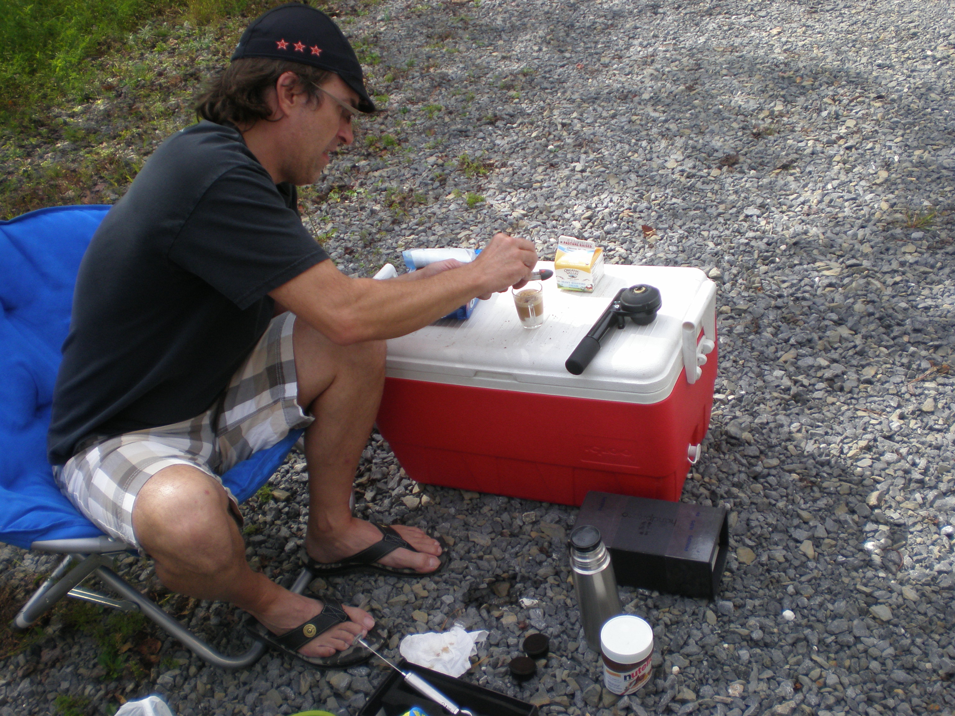 We awoke on a hideous gravel construction apron at the top of a mountain near the Trout Run exit from highway 15.  We hope to pay for parking/camping infrequently and will be “marking a stick” for every time we are asked to leave.  This was not such a morning.  We woke in sight of several houses, so we left even before making coffee!  First order of business:  stop at a gas station market and buy a coffee…oops, those breakfast sandwiches sure look good.  In fact they were.  My sausage,egg, and cheese muffin looked like one I might have made, but tasted even better!