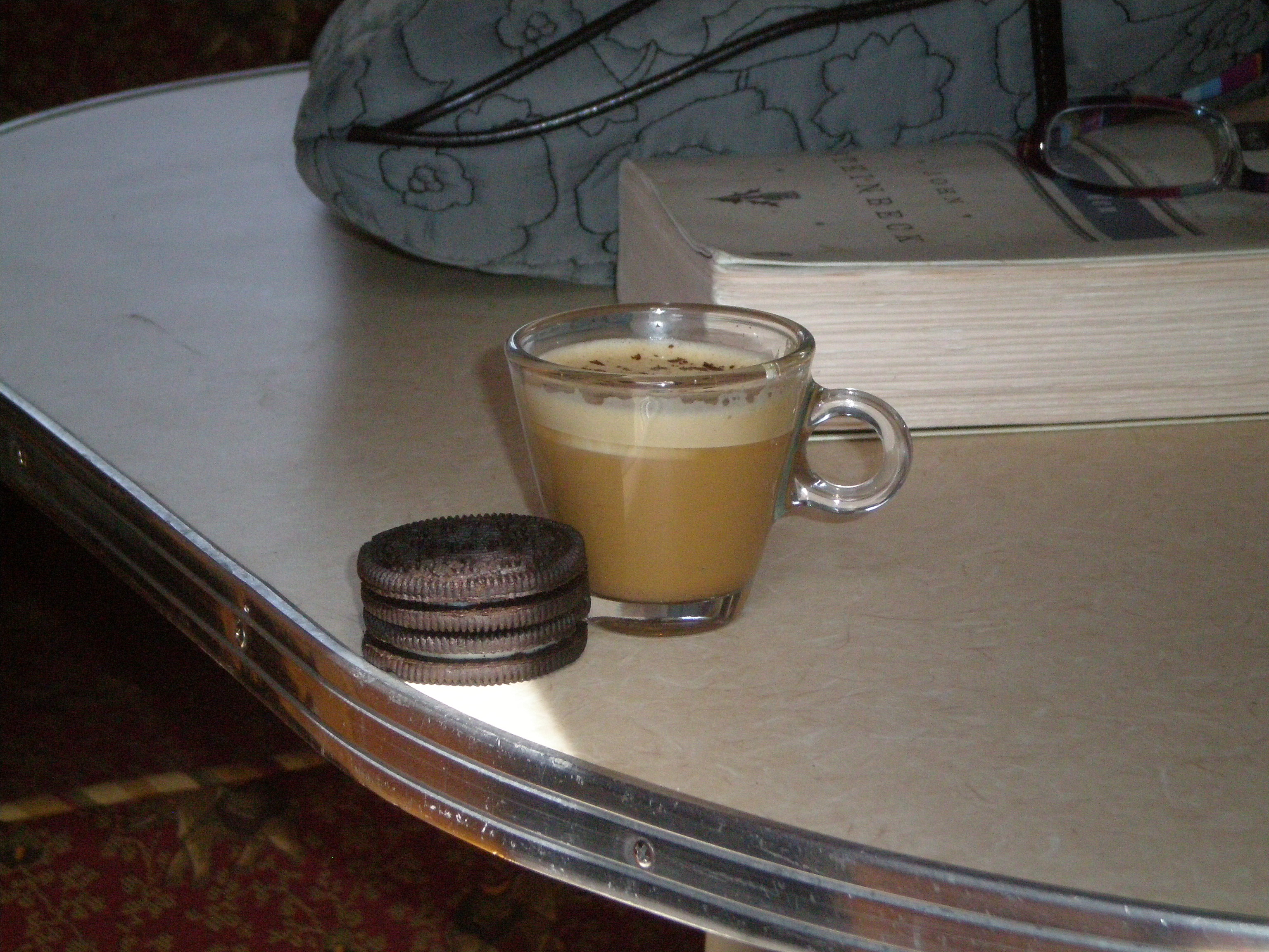 Made outside with a teeny battery-operated whipper, a teeny grater (for the chocolate on top) and a teeny press to raise the pressure to 100psi for the espresso! Starts out with the cream on the bottom, then it diffuses together.