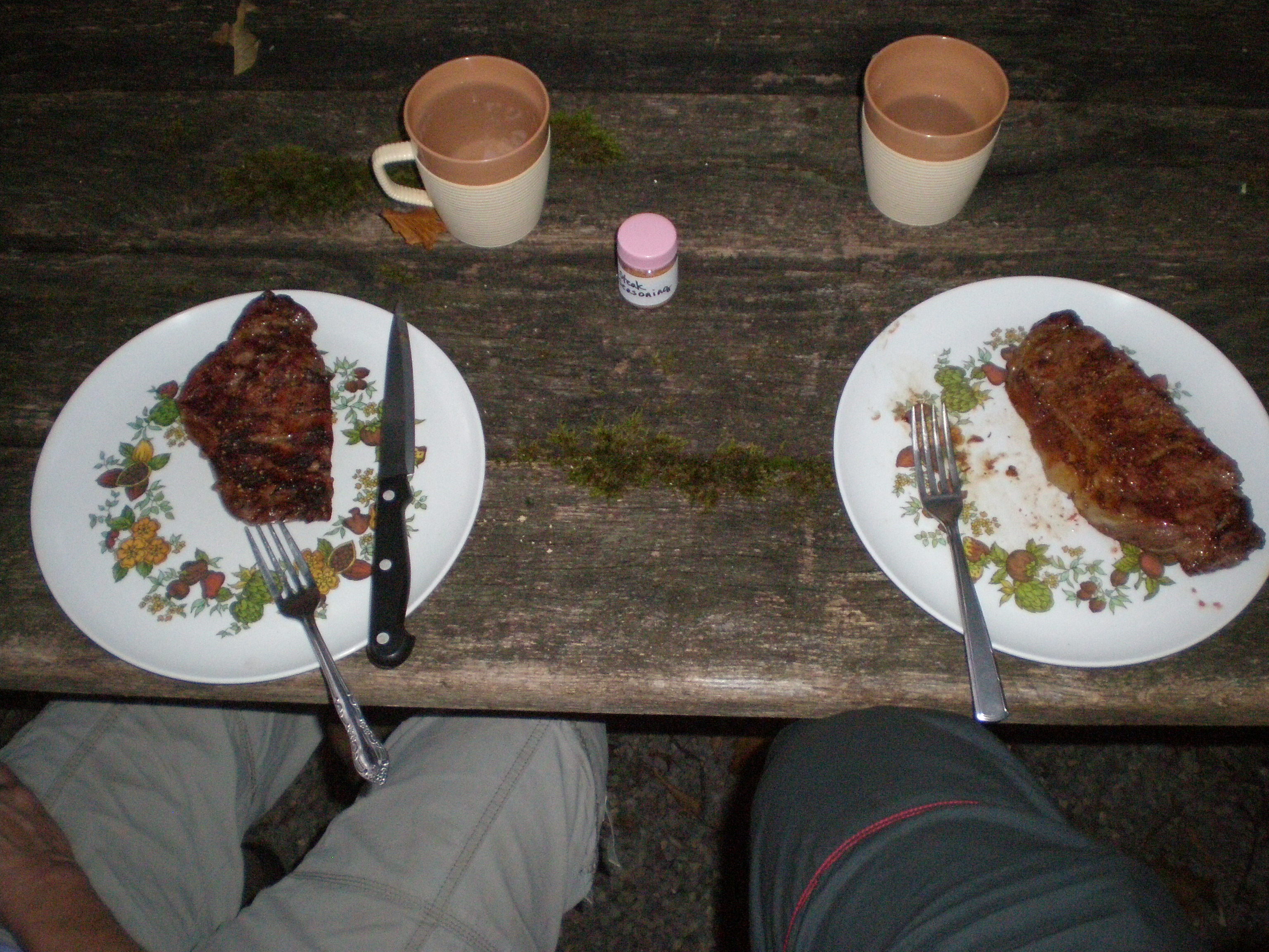 Evening brought the daily question;  “where are we gonna park?”  We asked a ranger who suggested Colton also.   Said there was no one there (literally, she checked the computer).  Sounded good, drove a forbidden backtracked 10 miles, but found a wonderfully empty park, drove through once (the requisite technique for camper-people) and picked site 3.  We needed a “legal” place to build a small fire for our celebratory cookout!  Jane, the AWESOME FIRE BUILDER, got things ready with our lightweight little grill.   Our warm, Baltimore friends Jean and Tom had given us each a thick, juicy steak for our trip.