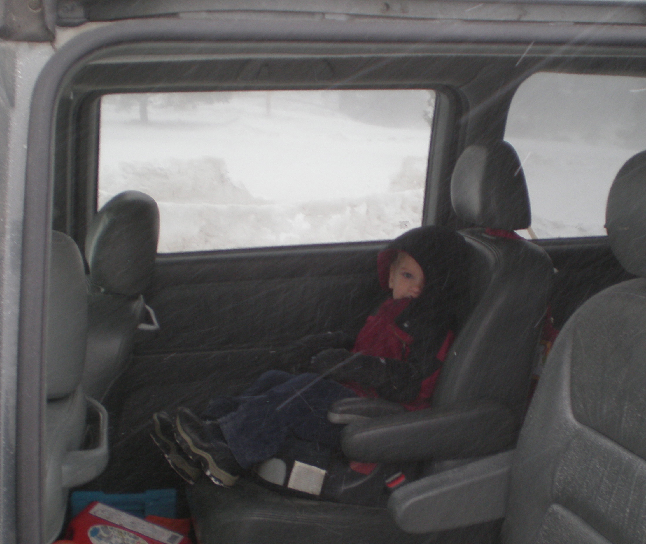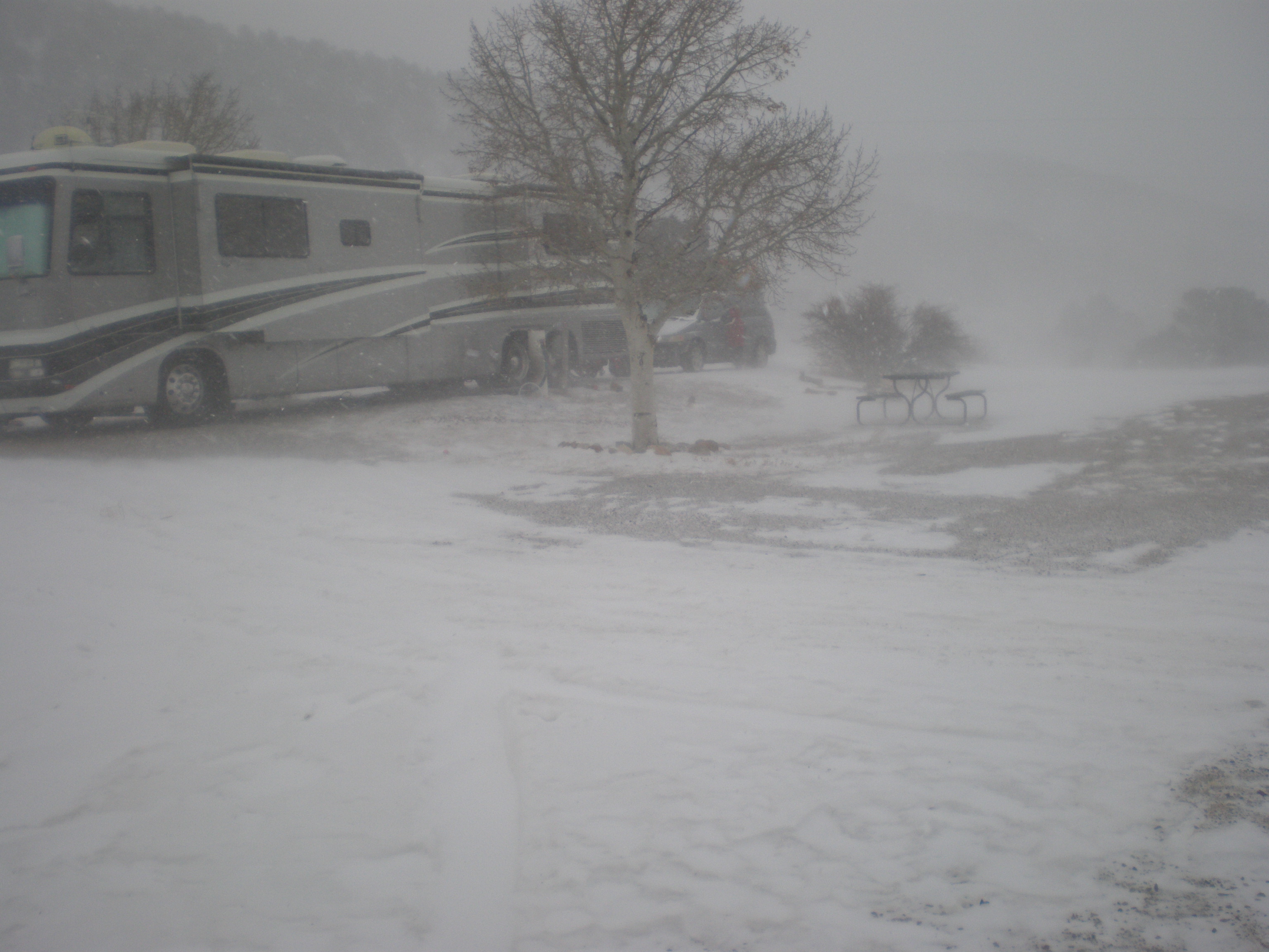 Gusts up to 45 mph are predicted for this afternoon. Snow showers skitter through the fields, then whirl high in the air around the campground.