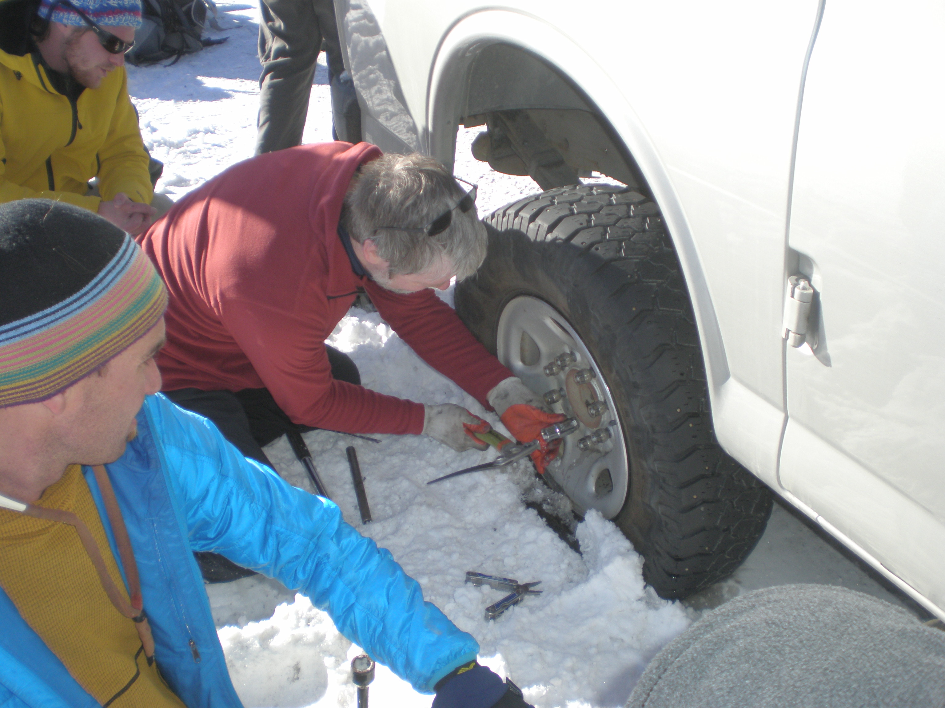 My next attack included a little trip back into my toolbox and some “creativity”. I grabbed a hacksaw blade, bent it at about the depth of a socket, 3/8″ or so. Then, a student handed me the key: A Bigger Hammer! This was no ordinary hammer, it was his ice axe. I pounded the socket over the lug nut with the hacksaw blade wedged into one flank of the hex. Pounded some more. I pushed down with all my weight and pressure inwards to keep that socket on. Not a budge, despite a few grunts and cuss words.