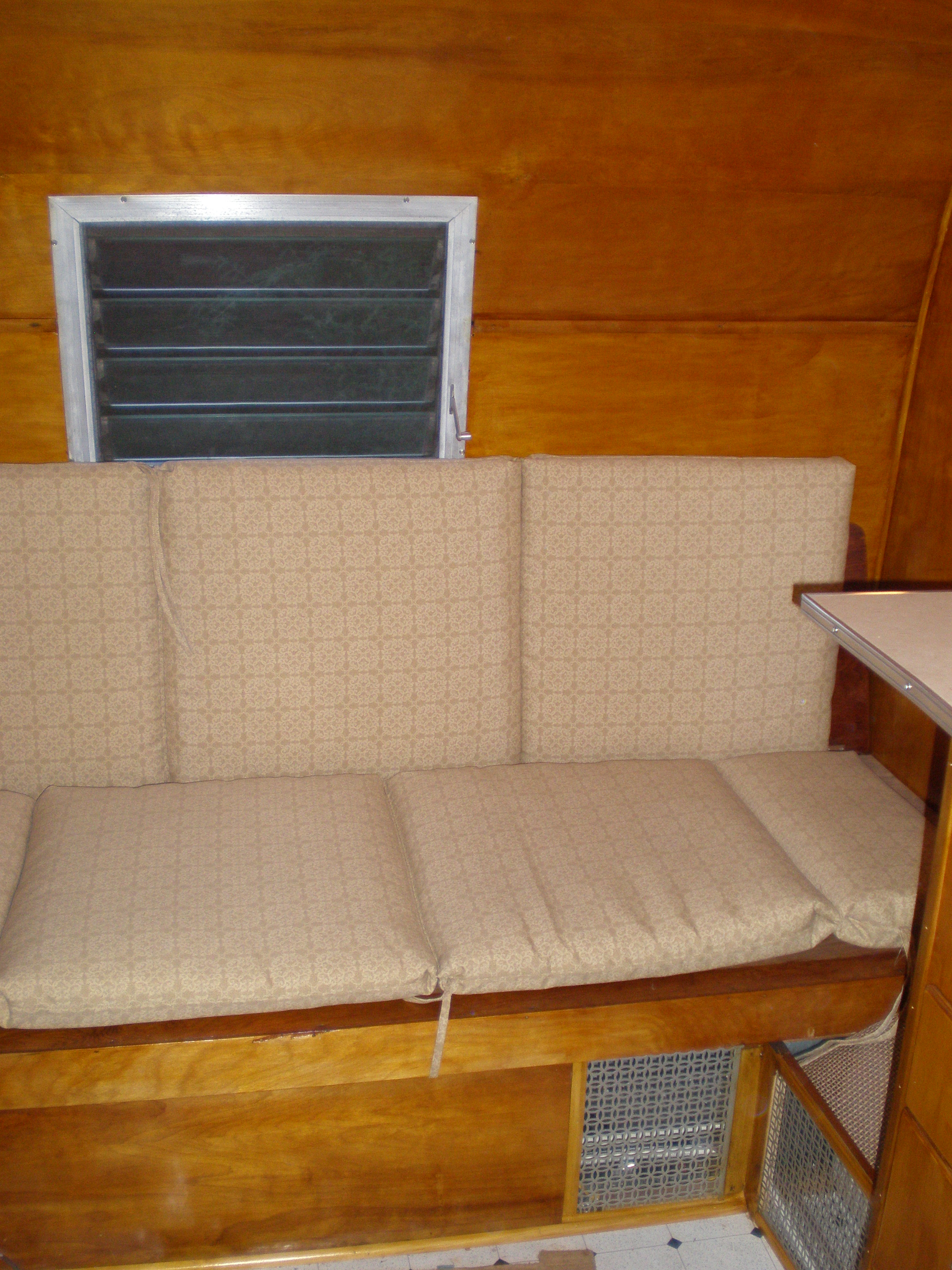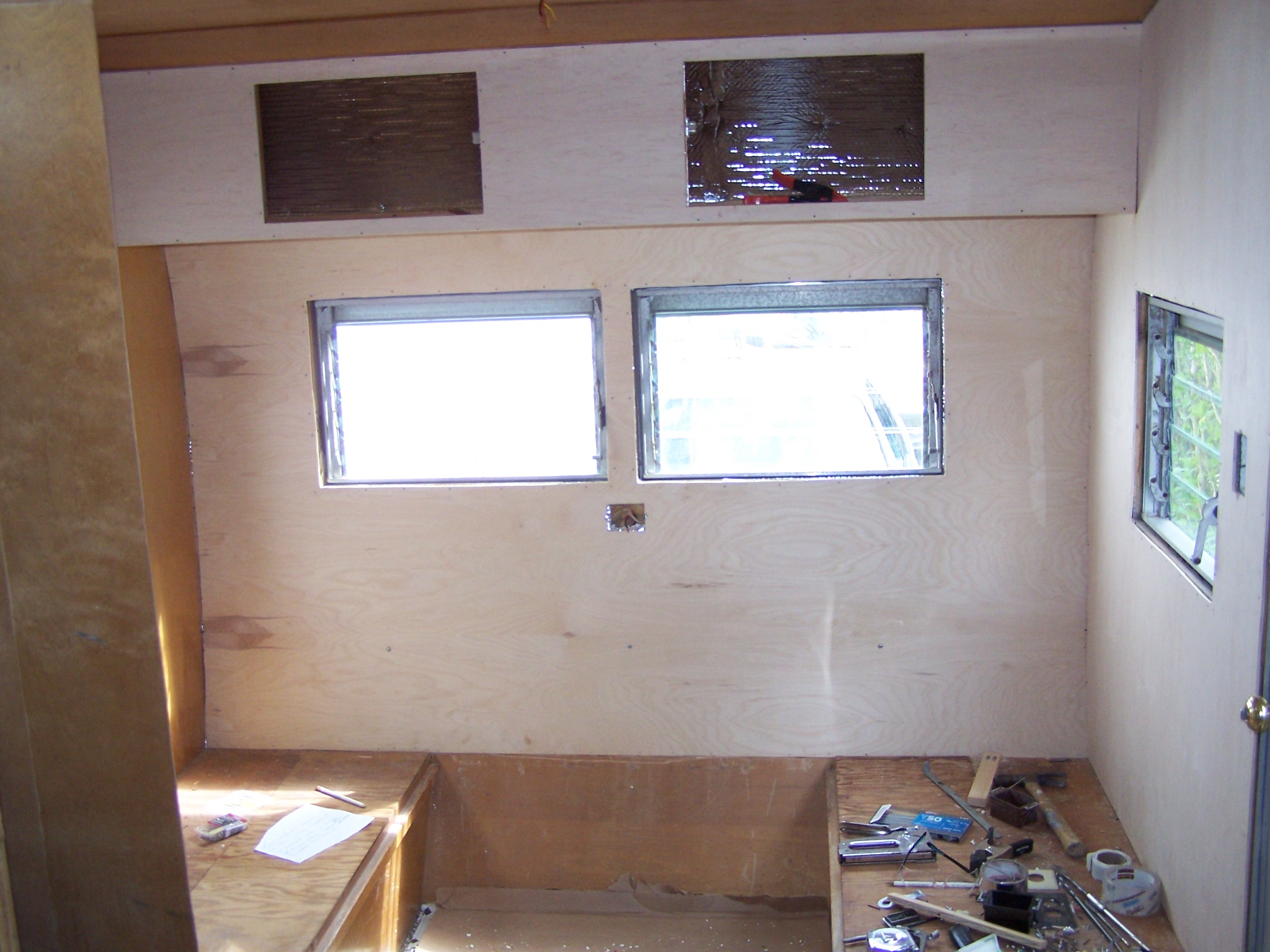 The Wave easily established and maintained the interior just above 50 degrees Farhenhite. Quite tolerable for a camp weekend, but needed improvement for a long journey. Underneath the pretty amber birch walls I added 1 1/2″ foam insulation and, most importantly, foil-bubble-foil all around. Similar to the stuff used for those silver windshield sunshades, this reflects “our heat” back in where it belongs. We are noticeably warmer with a lot less effort.