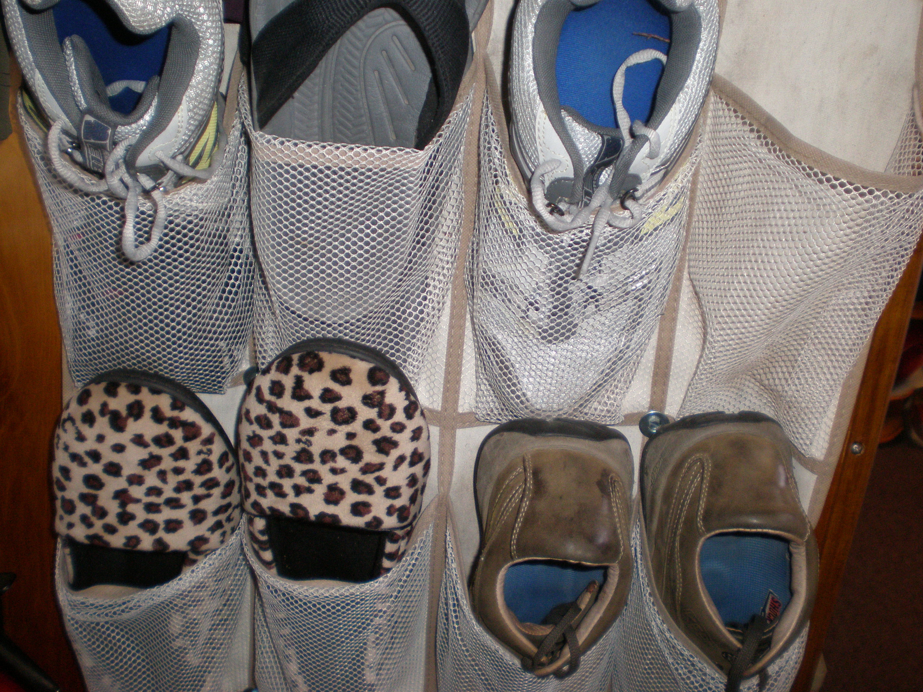 There were cabinets within the Tramper when I brought it home, but we’ve redone as needed. the new fridge is about an inch wider and 4 inches deeper than the 1957 version. I built an entirely new unit on that side. Then added shelves with the bottom one engineered around our 2 ski boot bags. Each of us has one basket to contain “all clothing for the whole trip”. We minimized over and over to get to this point and wash small items regularly, hanging them to dry for the next use. Here the air is so dry, things dry amazingly fast. Rosendale, NY during the cold, dank Fall was a little different. We had to aim our heater at the laundry lines.