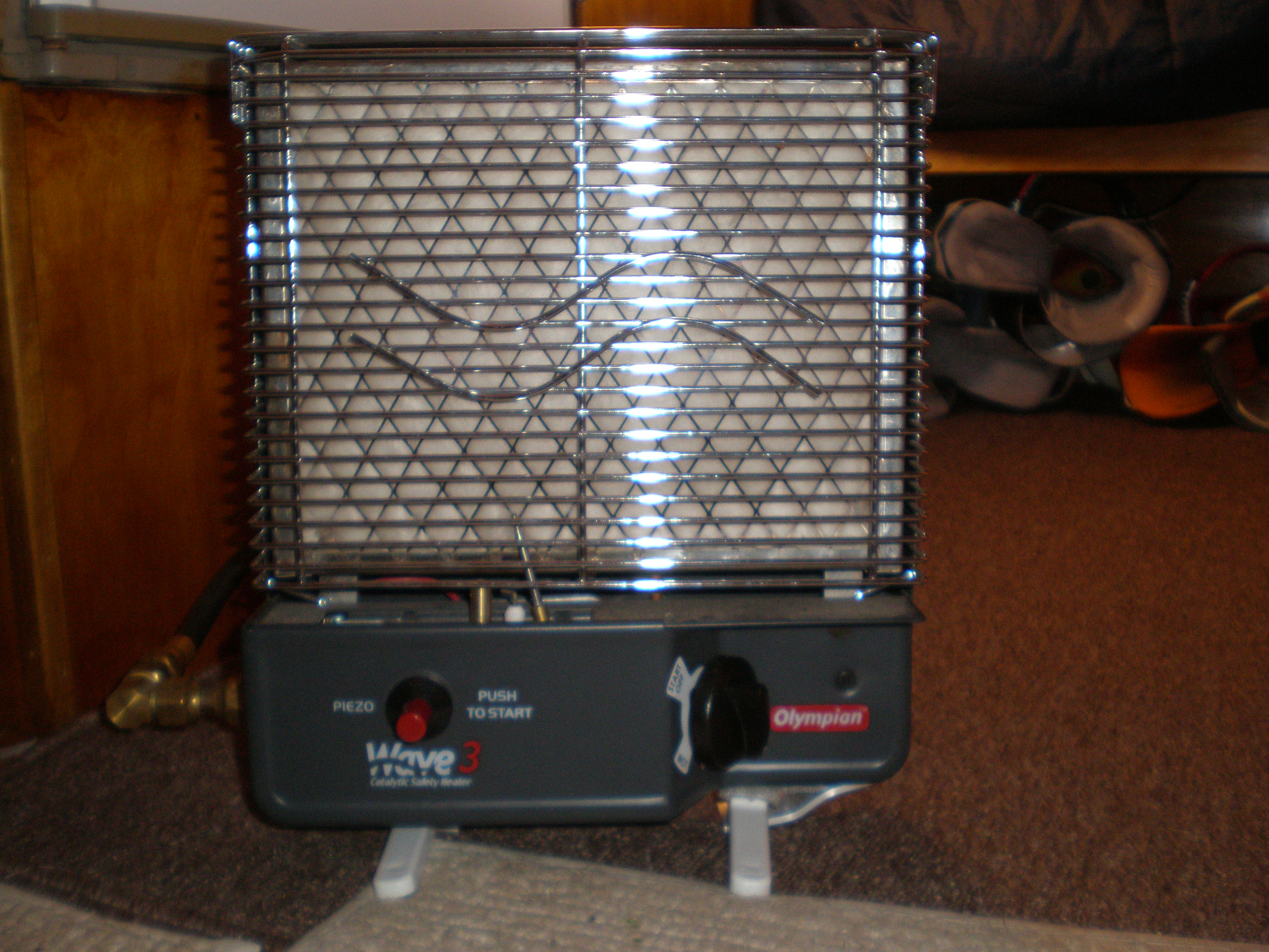 This little furnace is 93% efficient, it burns propane on a catalytic grid and emits only CO2 and water. No carbon monoxide, just need to keep venting in a little air. Pretty handy in a space this small. The old flame, blower, and chimney propane furnaces are less than 30% efficient. And considerably bigger.