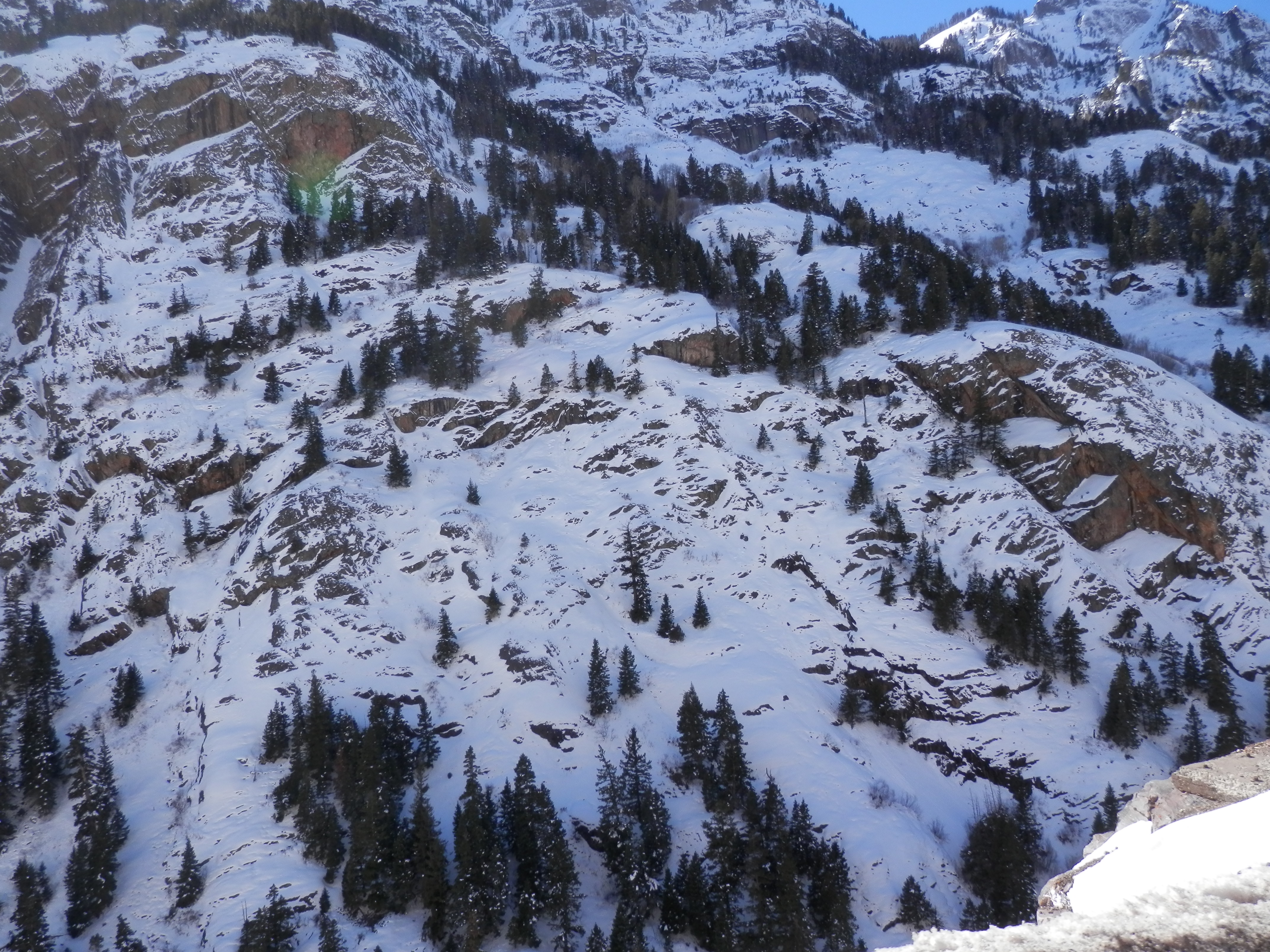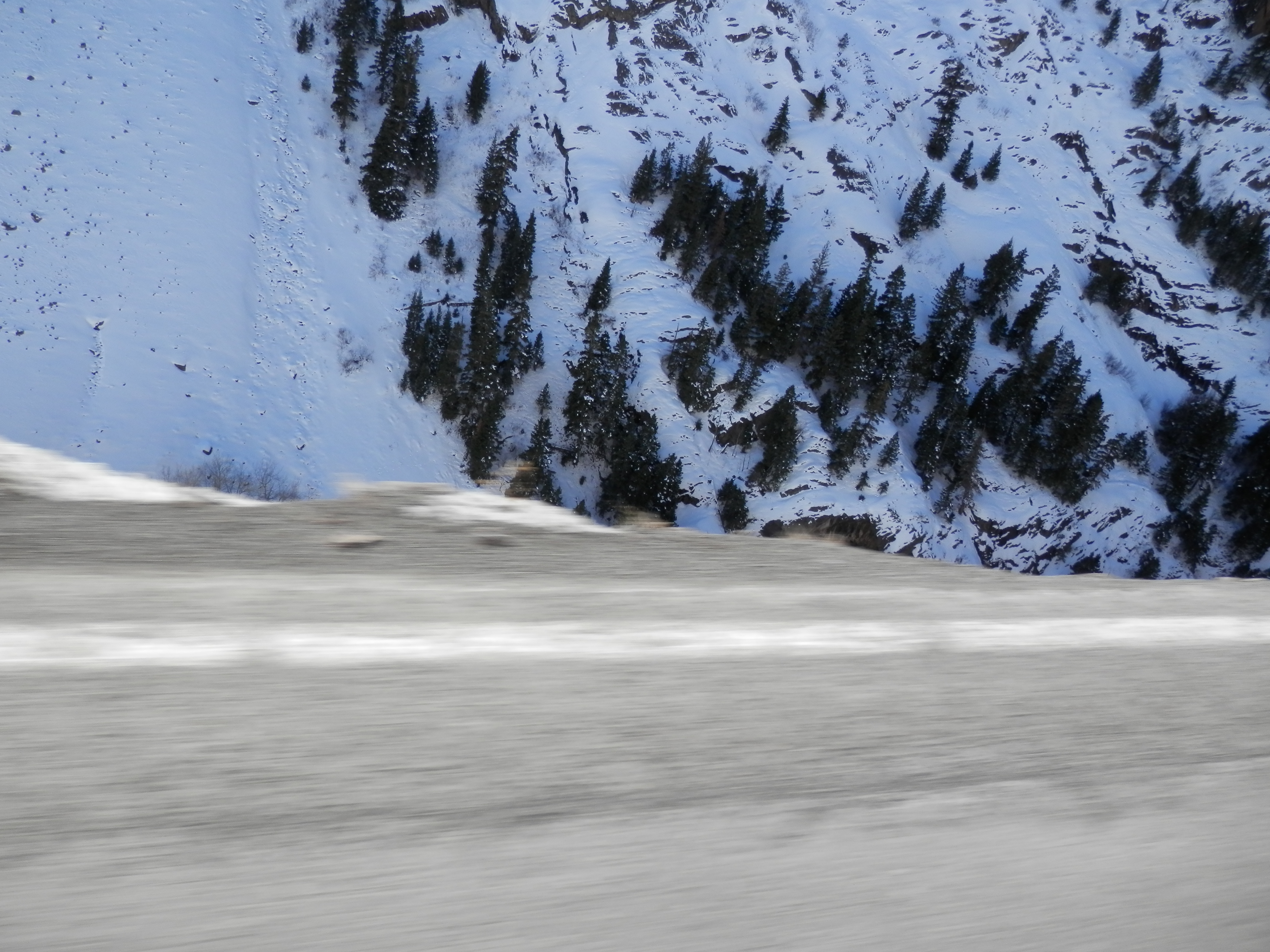14 miles uphill at 20-28 mph, no guard rails, thousand foot cliffs, very few pullouts, warnings not to stop secondary to avalanche areas and more than a few ice chunks falling on us while we crawled! WOW! Did I say Monarch was stressful? We pulled into a small passing area and I pulled all of the cardboard that had been shielding the shivering radiator and transmission cooler from the Winter’s air for the past months. Poor gal, she needed all the air we could give her on THIS climb! We made it.