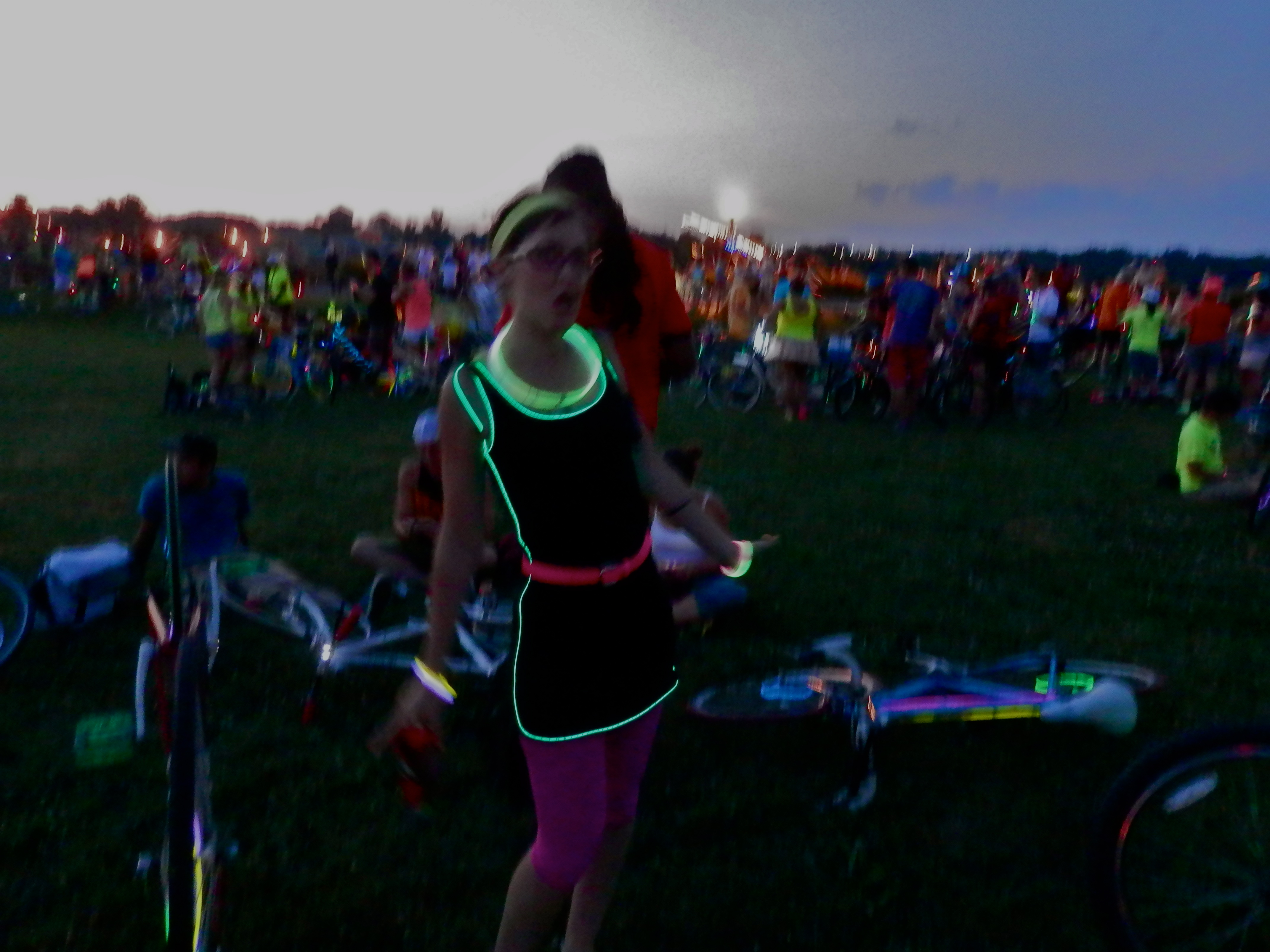 At the midpoint. As night fell, this woman’s dress came alive (with David’s spare batteries to the rescue, as she had forgotten her power source)!