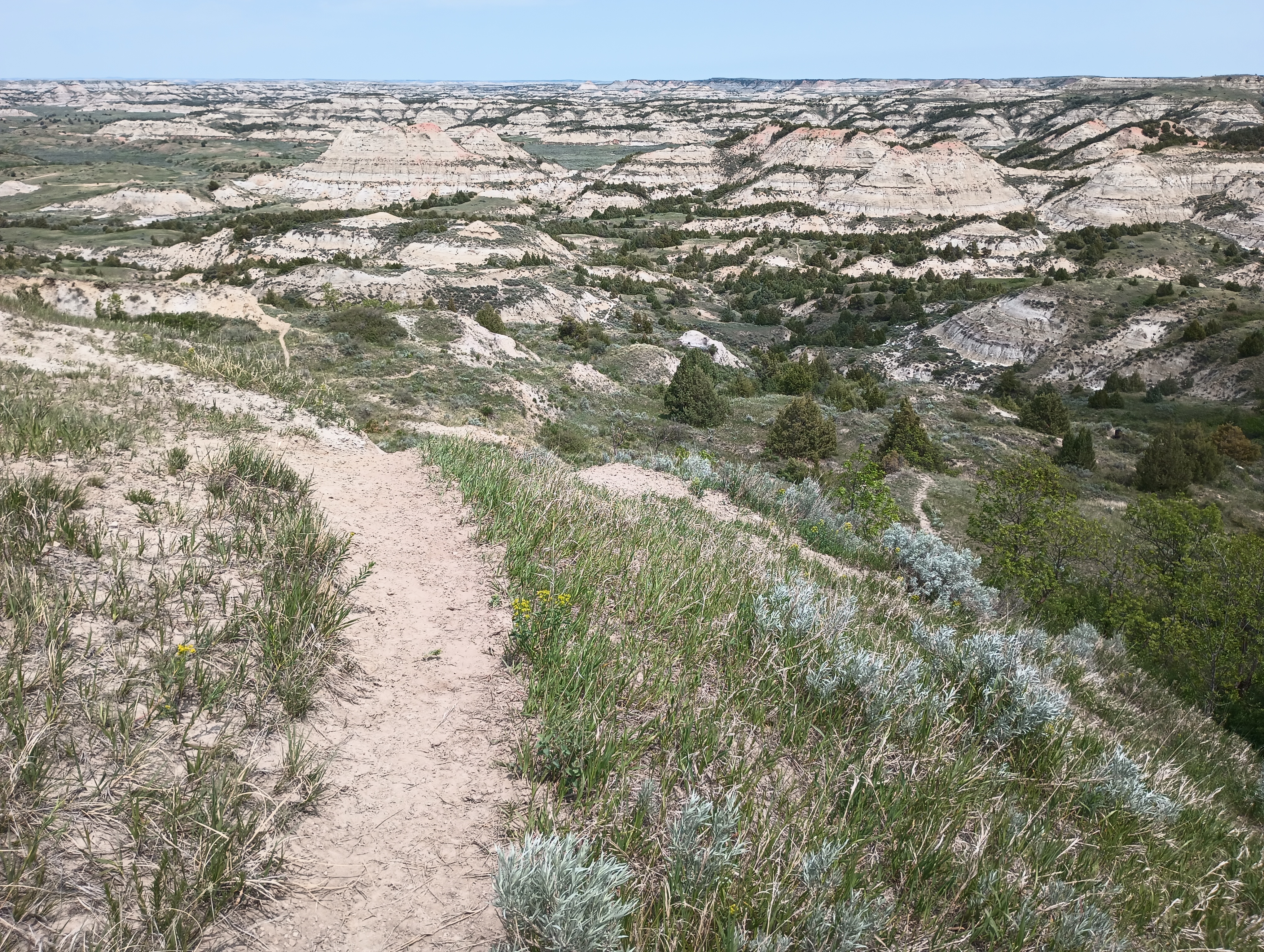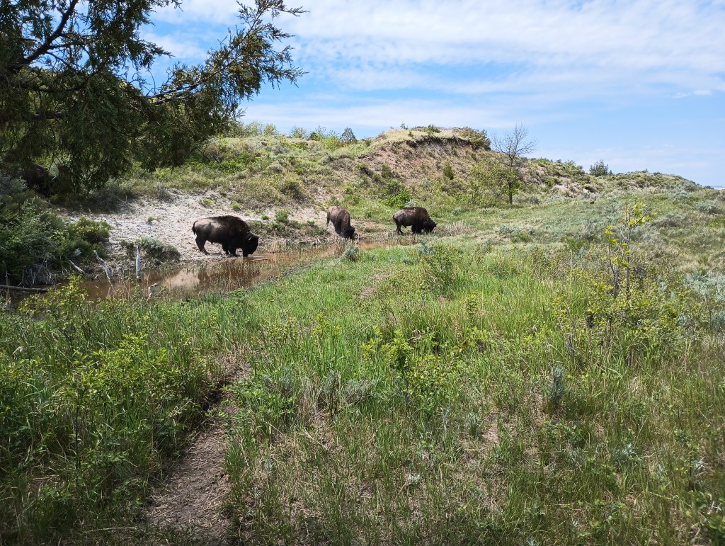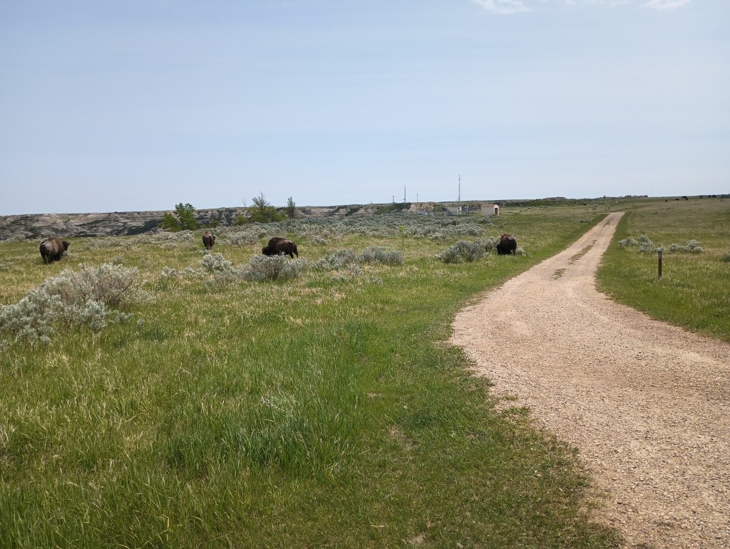 As usual, one activity wasn’t enough so we went off to the visitor centers to talk to rangers about a good hike to complete the day. We listened intently to the basic bison instructions, “there may be a herd at the visitor center fields, but they are pretty docile right now, not calving and just move slow, keeping your distance of 2 school buses or more”. “They may be grazing near the trail, but you can go by, just be predictable, talk low tones and don’t go closer to them”. We picked a trail with plenty of elevation change, it drops down into the canyon with switchbacks immediately after a half mile on the flat.