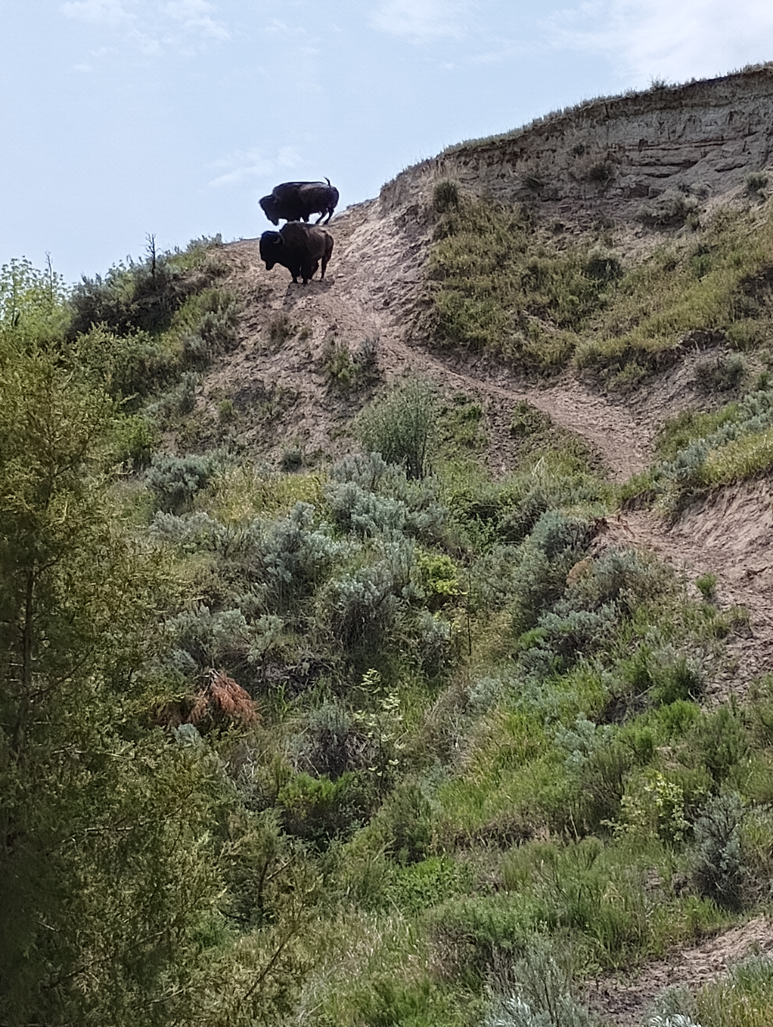 The trail was dusty-dry and dropped steeply, enough so that I was sitting my butt down a bit to dig in the heels of my boots. Yes, both of us prefer heavy boots above the ankles. We know that real hikers, even AT hikers wear trail running shoes, but the tread and weight of boots is protective and predictable. yep, immediately near blinding down a narrow single track we weren’t more than 1-2 hundred yards in than I looked back and there were bison following us! I told Jane, sending her ahead of me and said I’d figure out if they were faster or slower than we. It seems our natural pace was just a bit faster, so I pressed to keep going as we surely weren’t going to go straight up that pitch to head on with a bison.
