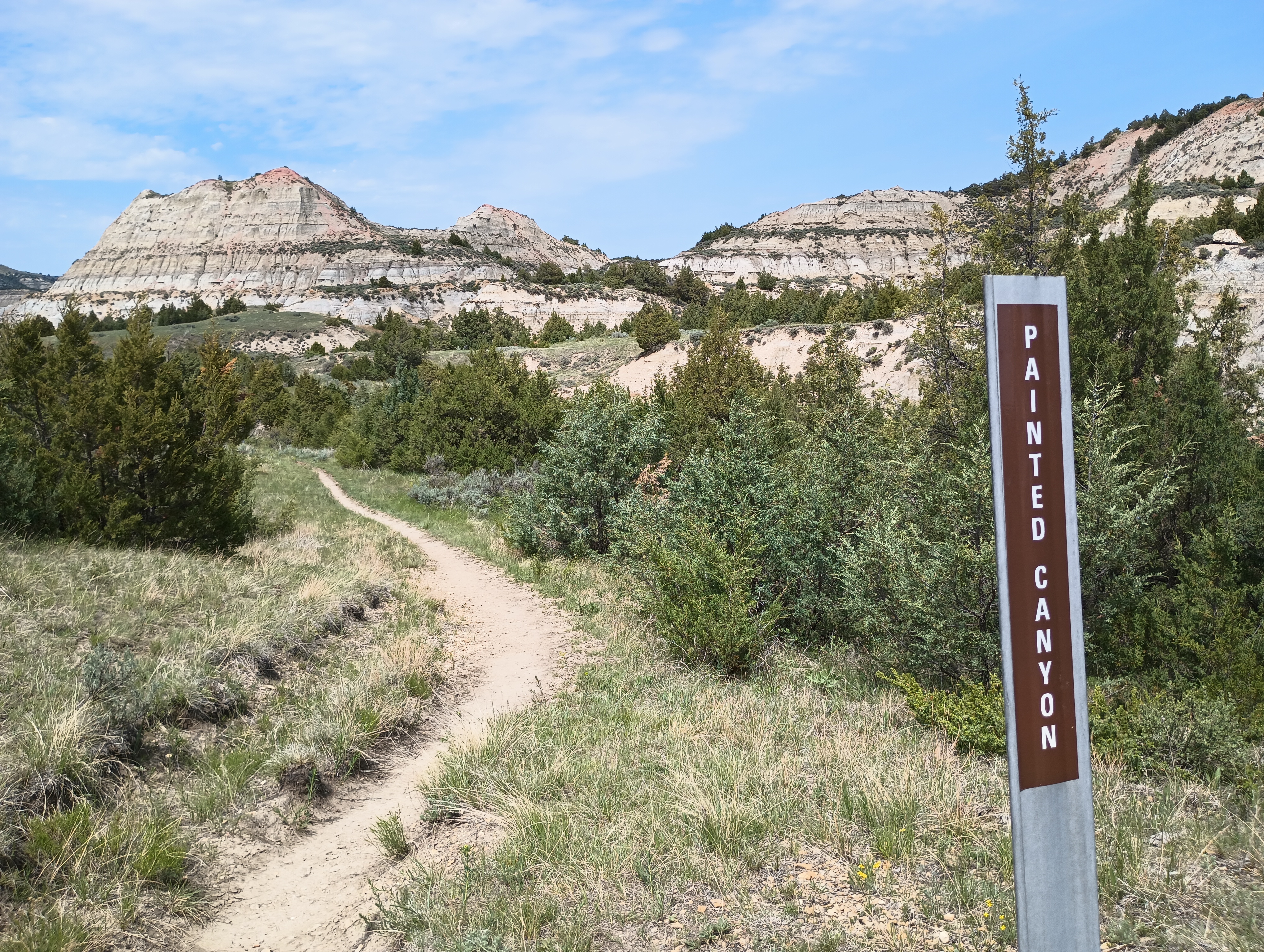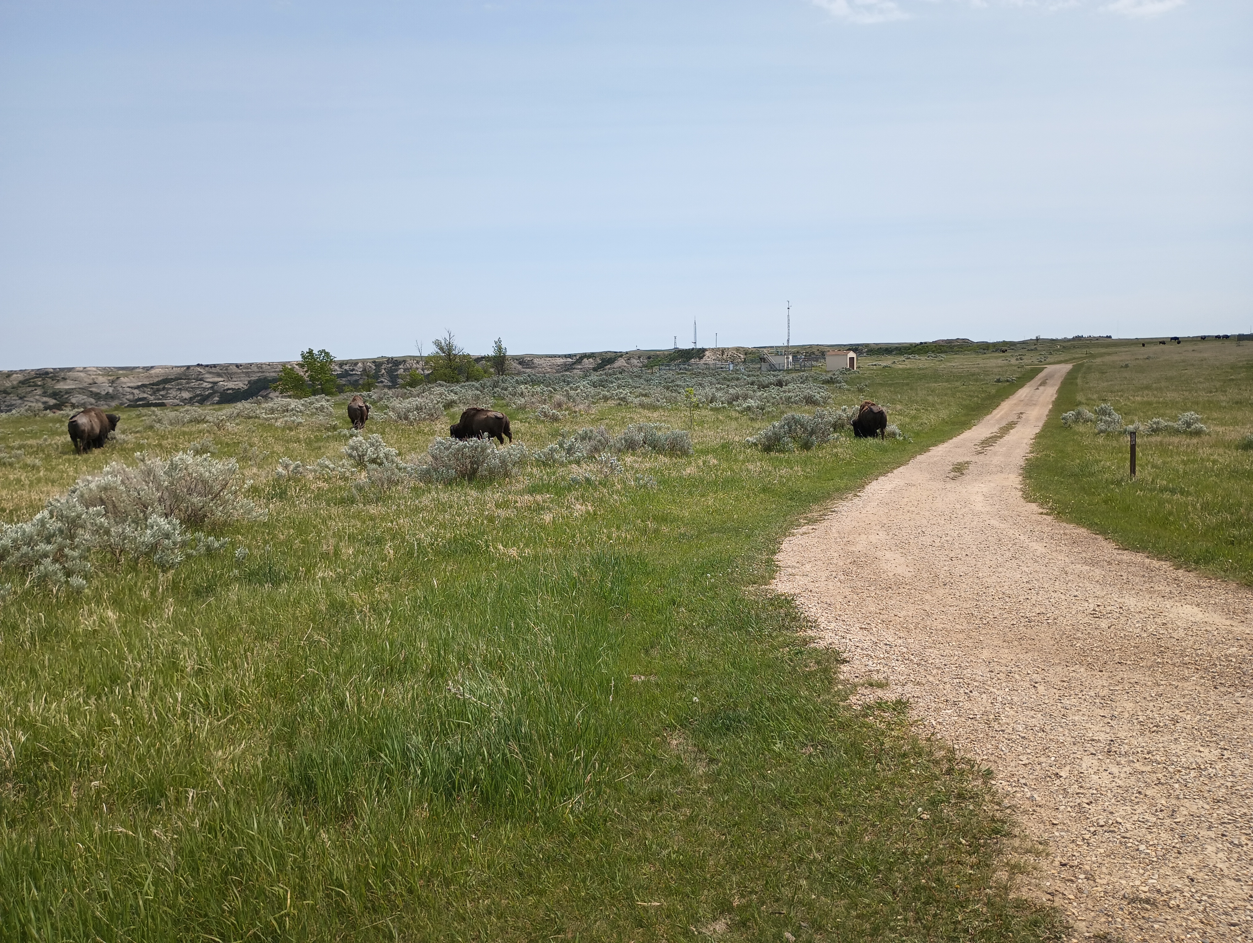 It was a long wait, but my call was to walk out into the middle of the field, outside of the first two. Then we kept going at that distance until we saw the clear chance to walk back across the field to get back onto the trail. By this time, all of this was in sight of the Painted Canyon visitor center and a huge parking lot.