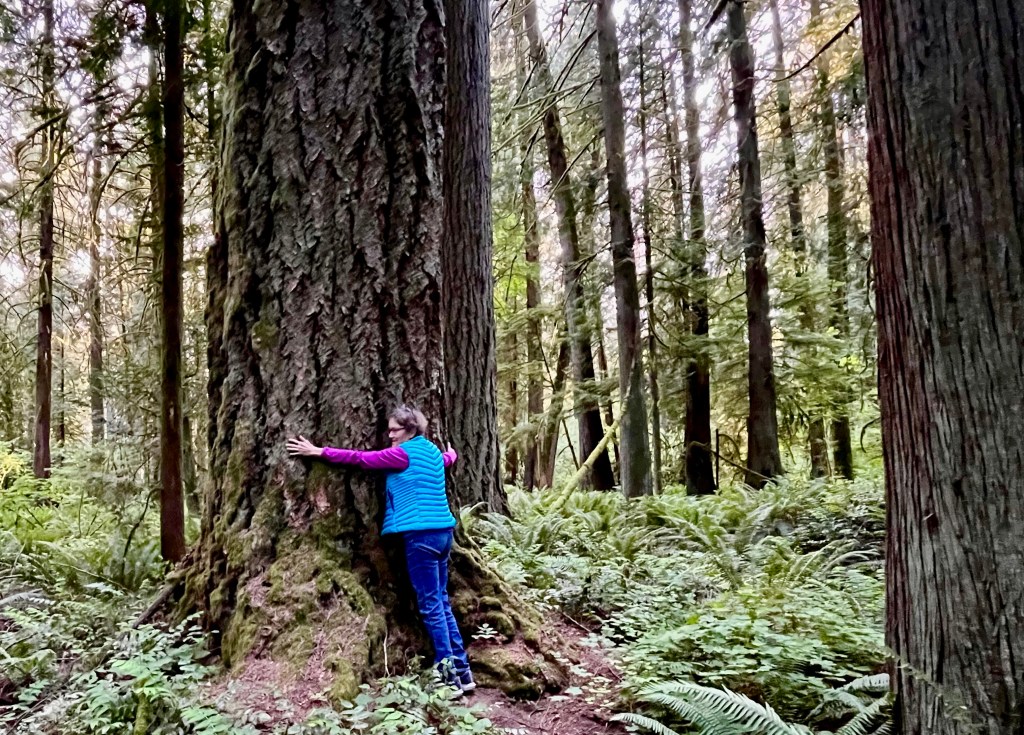 The next turns included traffic jams in Seattle, then to Dash State Park South of Tacoma. Another great forest! Still brewing my reactions we went to perhaps the “oldest growth” yet in Lewis and Clark State Park. The first day trip from there took us to Mt St Helens. During the drive we saw bare hills, roughly stripped of every tree, other mountains stripes of tall trees between bare patches. Whole mountainsides denuded of all trees as well as varied areas replanted and labeled with the year planted. But the 616 acres were an amazing refuge in Lewis and Clark State Park, so much we stayed two days. The green, ghostly snags and even living trees were massive co-working organisms to gawk at. They got me looking, thinking and writing all this stuff.